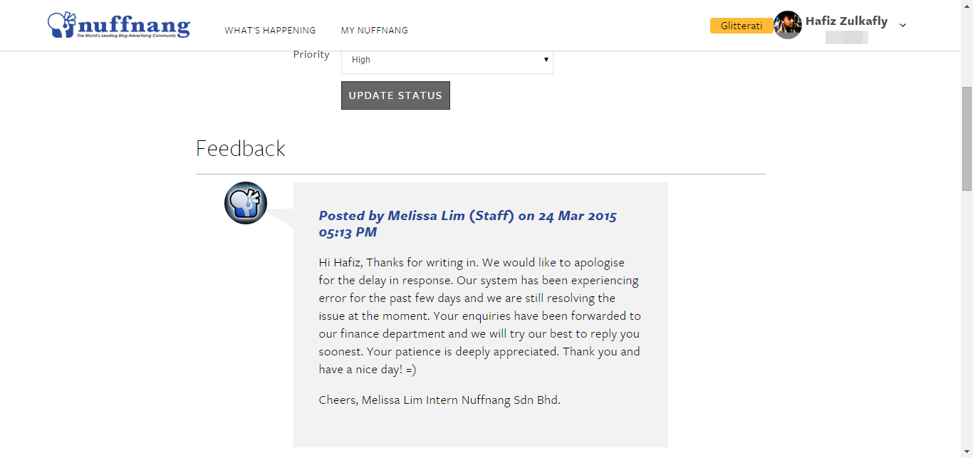 Kenapa takde apa apa record dekat situ? Musykil. Sebab total earning dia dah deduct. Tapi dekat payment history takde apa apa. Takkan duit burn macam tu je. So dengan berbesar hati, aku submit ticket dekat pihak nuffnang. Priority aku buat high sebab aku perlukan penjelasan yang cepat pantas and jelas. Hahaha. Tapi sayang 4 hari kemudian baru deme balas ticket aku :'(